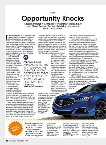 Acura Precision • 24th June 2017 Opportunity Knocks A record number of Acura leases will mature this summer—and Piazza Acura of Ardmore is seizing the chance to retain those clients
