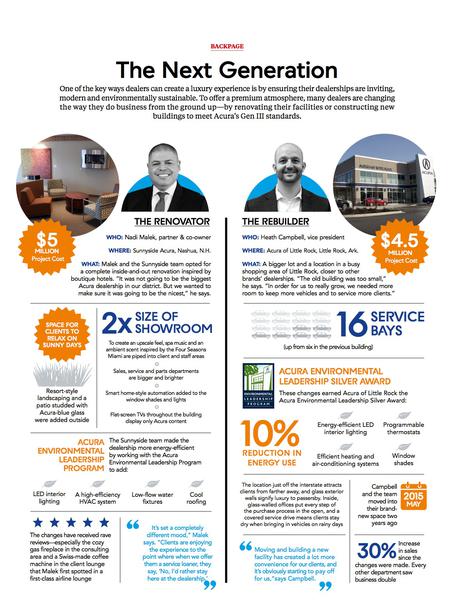 Acura Precision • 24th June 2017 The Next Generation To offer a premium atmosphere, many dealers are changing the way they do business from the ground up—by renovating their facilities or constructing new buildings to meet Acura's Gen III standards