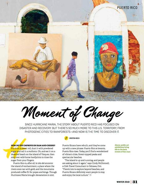 CAA Magazine • 5th November 2019 Moment of Change Since Hurricane Maria, the story about Puerto Rico has focused on disaster and recovery. But there's so much more to this U.S. territory, from photogenic cities to rainforests—and now is the time to discover it.