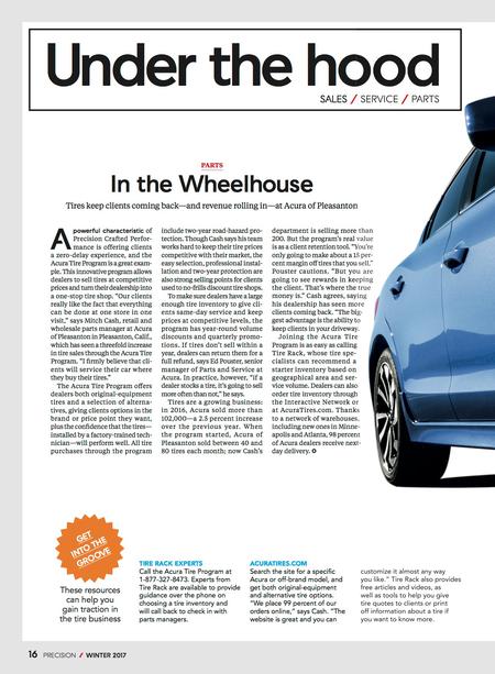 Acura Precision • 24th January 2017 In the Wheelhouse Tires keep clients coming back—and revenue rolling in—at Acura of Pleasanton